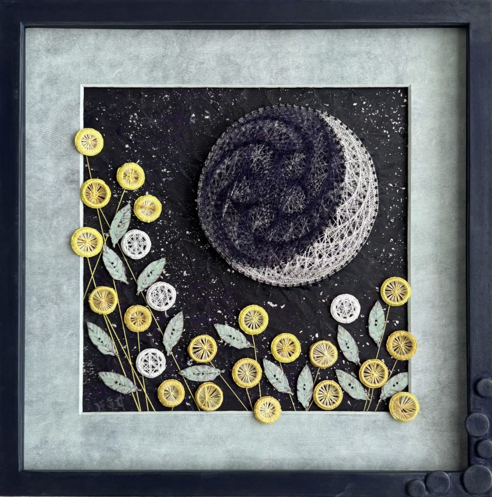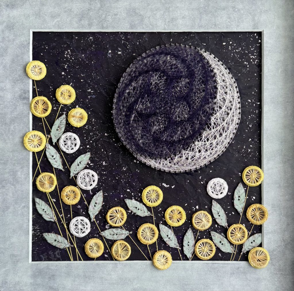 | size:300x300mm+ 背景:和紙(阿波紙)に水干絵具・岩絵具・銀箔 使用糸:シルク糸・銀糸 price (額装込):¥180,000 (税込¥198,000) |